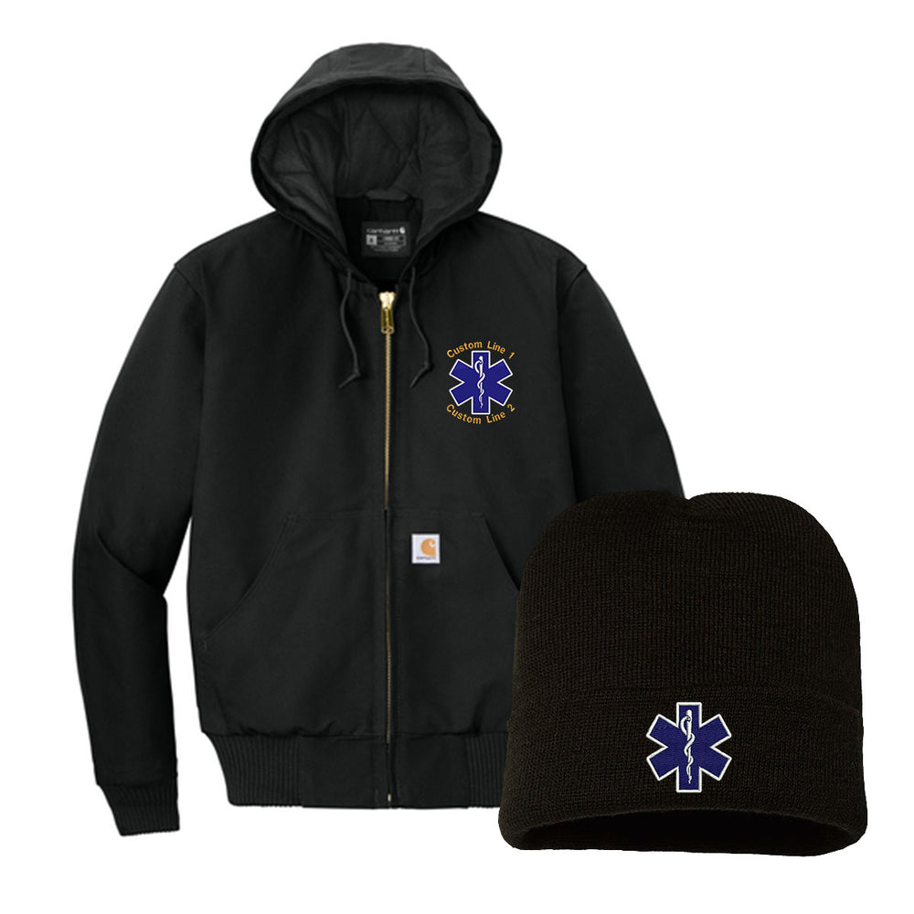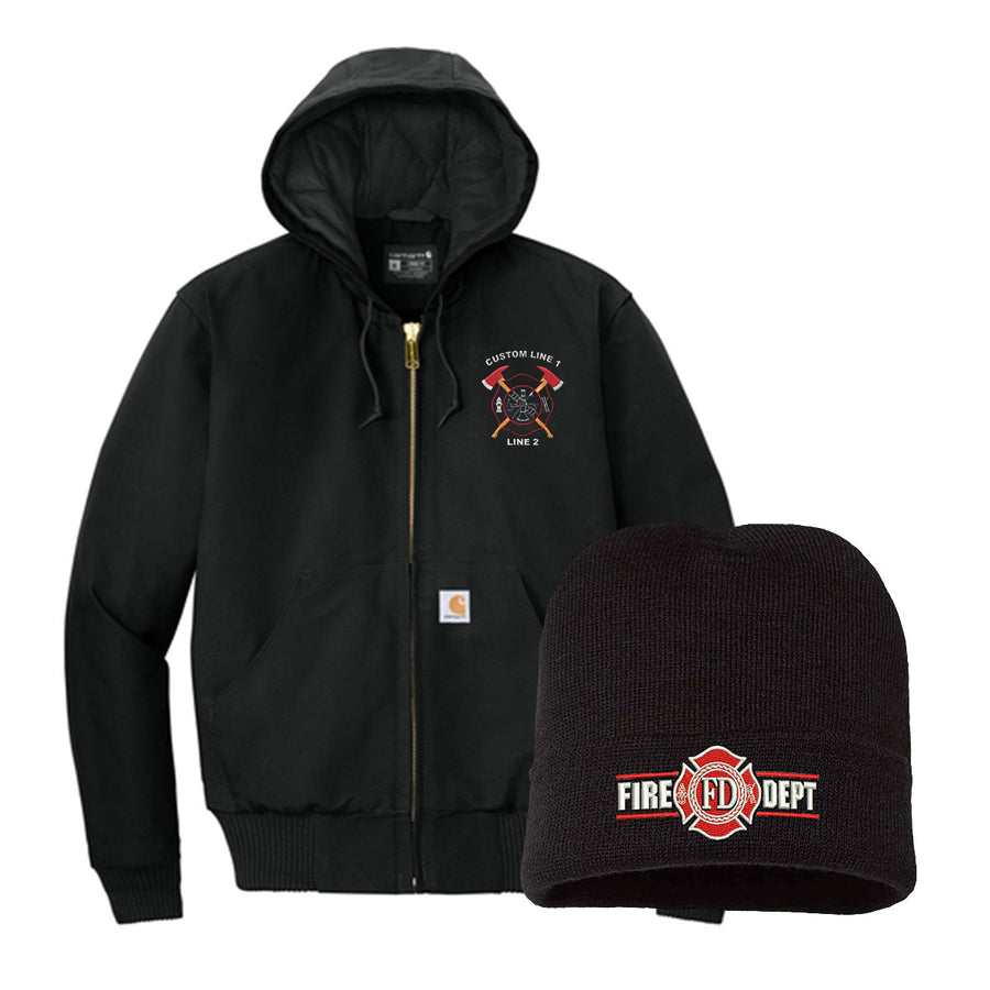 Stay warm this winter with the Carhartt® Quilted-Flannel Jacket & Beanie Bundle. Customize your jacket with either the Fire Rescue, Crossed Axes, or Star of Life design, plus up to 2 lines of personalized text in your choice of thread color. Each bundle comes with a matching knit cuffed beanie to complete the set.