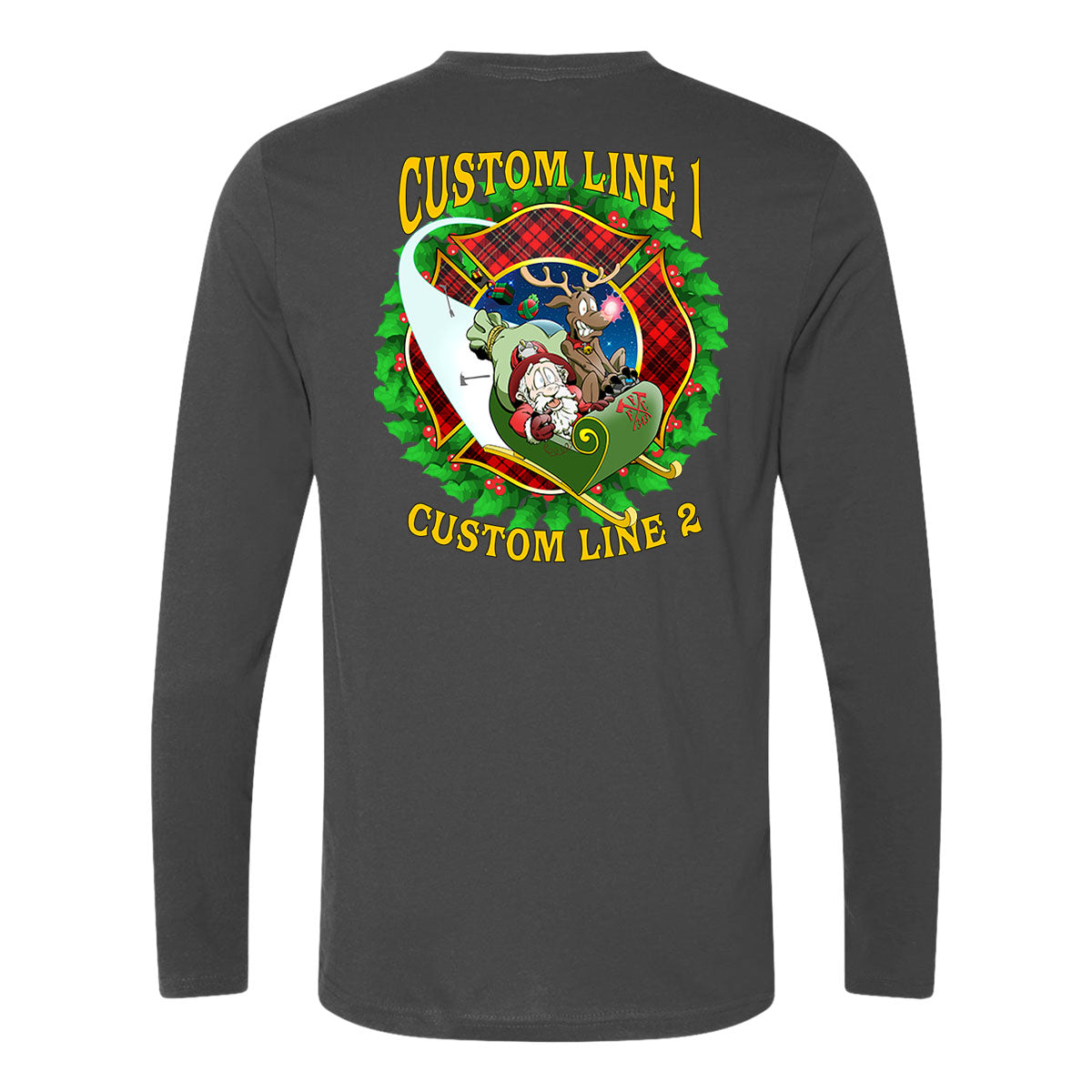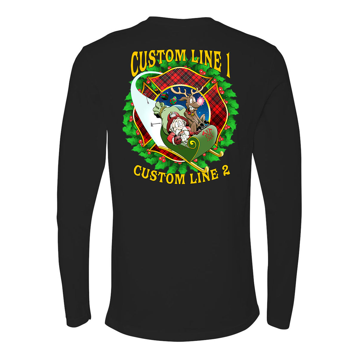 The Custom Firefighter Christmas Wreath Plaid Maltese Premium Long Sleeve Shirt brings firefighter pride to the holidays. Featuring a plaid Maltese over a wreath with Santa and his deer at the center, this design lets you add custom text on the top and bottom for your crew or department.