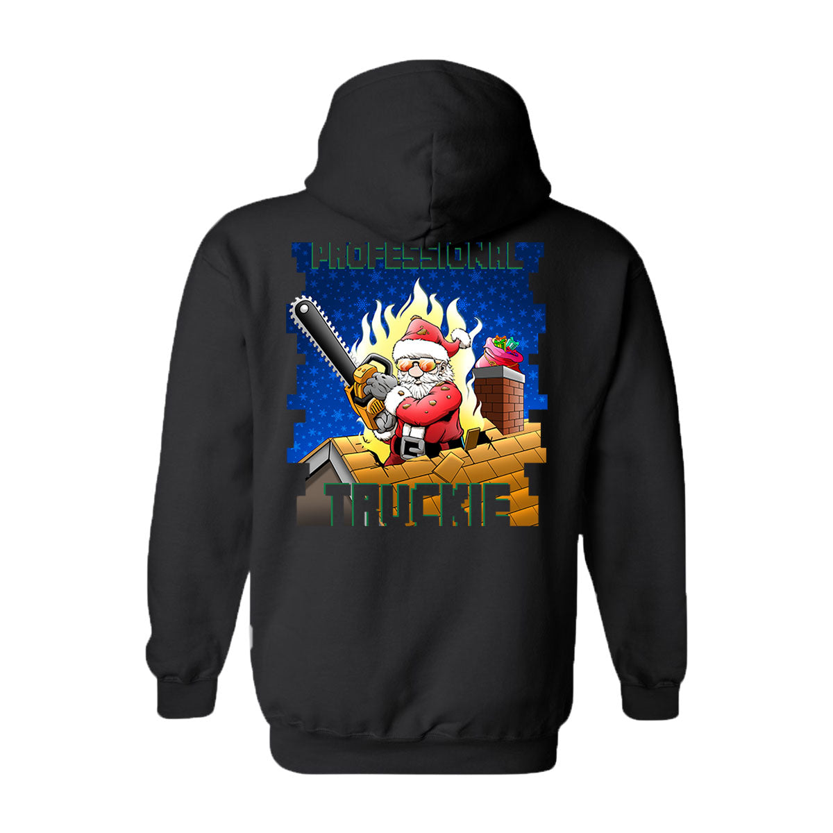 The Professional Truckie Santa Firefighter Premium Hoodie brings Christmas spirit with a firefighter twist. Santa’s geared up with his chainsaw, flames behind him on the chest, and a bold back print showing him cutting through the roof with “Professional Truckie” across the design. Comfortable, warm, and made for firefighters who keep the firehouse energy alive through the holidays.
