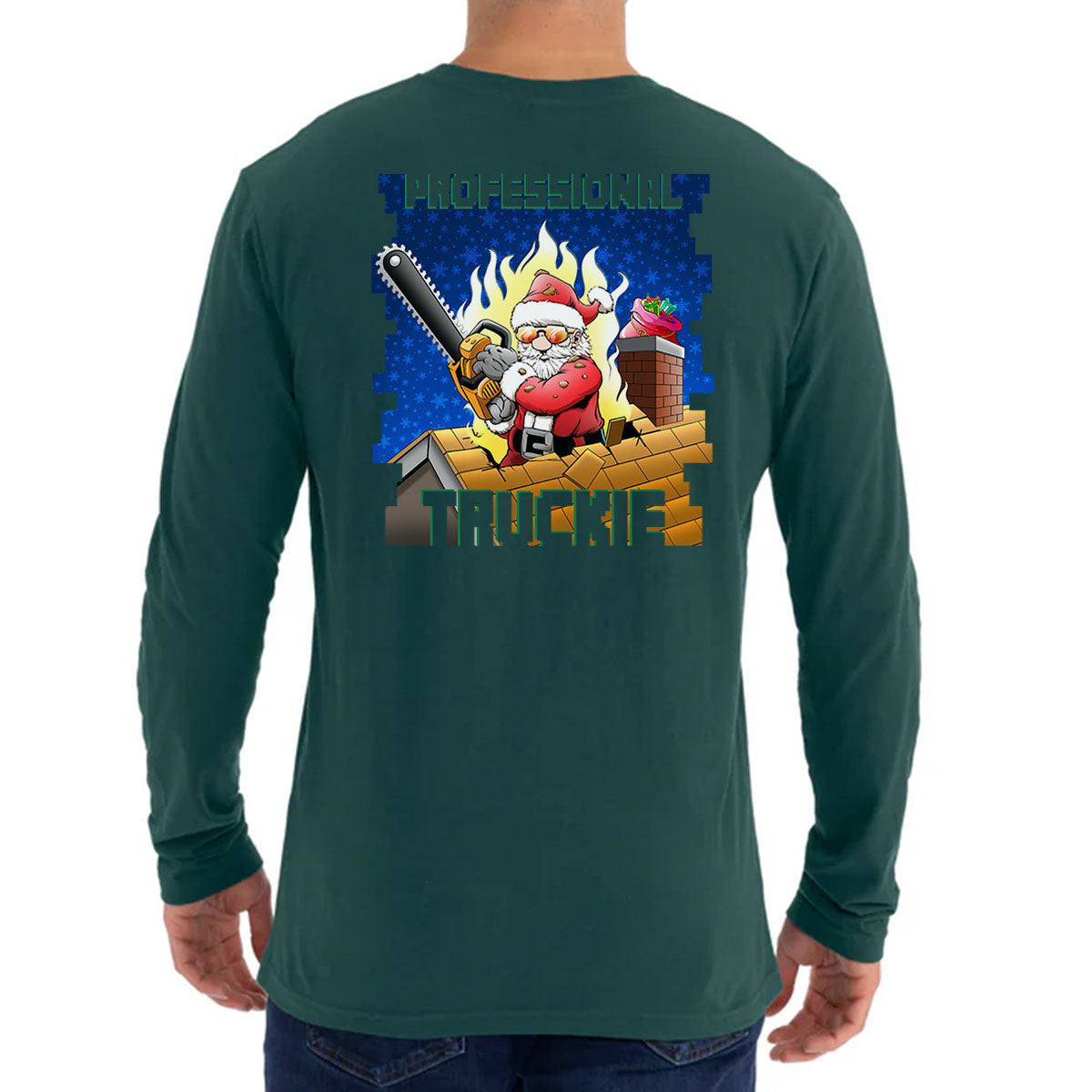 The Professional Truckie Santa Firefighter Premium Long Sleeve brings some humor and holiday spirit to the station. Santa’s got his chainsaw ready, flames behind him on the chest, and the full back shows him working the roof with “Professional Truckie” across the design. A solid piece for firefighters who like to keep things light around Christmas but still take pride in the job.