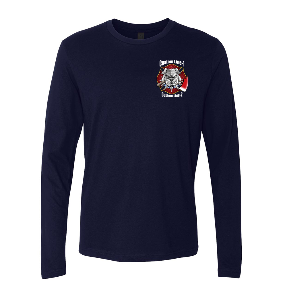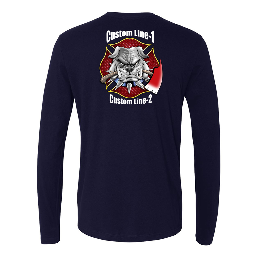 A Firefighter Classic Fire Station Design Featuring a Bold Red and Yellow Maltese Cross with a Fierce Bulldog holding a Fire Fighter Axe. Personalize this premium 100% soft style cotton Long Sleeve Shirt with two custom text lines. Perfect to add your Fire Department Name and Station Number to the front left and full back print. This premium shirt is tailored at the waist for a modern fit.