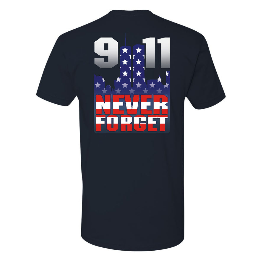 Exclusive Firefighter.com Design in honor and remembrance of 9/11/01 First Responders that gave the ultimate sacrifice on the fateful day. Front Left Chest features Firefighter Maltese Cross honoring the 343 firefighters of 9/11 with the twin towers silhouette draped in American stars with Never Forget dressed in America's red and white stripes. The Full Back design features 9/11 with the star silhouette and stripes honoring all the first responders and civilians that lost their life.