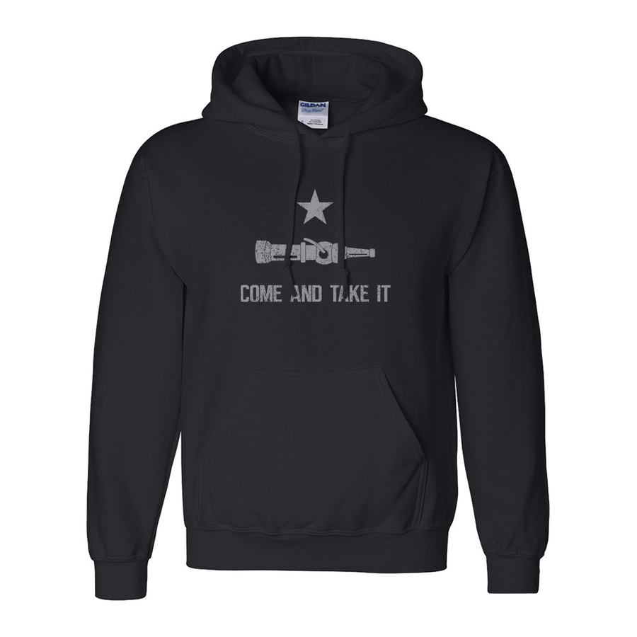 A trending design with a firefighter twist. Come and Take It design features the lone star, a firefighter hose nozzle an the historical phrase "COME AND TAKE IT". This full front design is distressed printed in light grey with the FFC 343 crossed axes on the sleeve on a soft premium hooded sweatshirt. The ideal off duty firefighters.