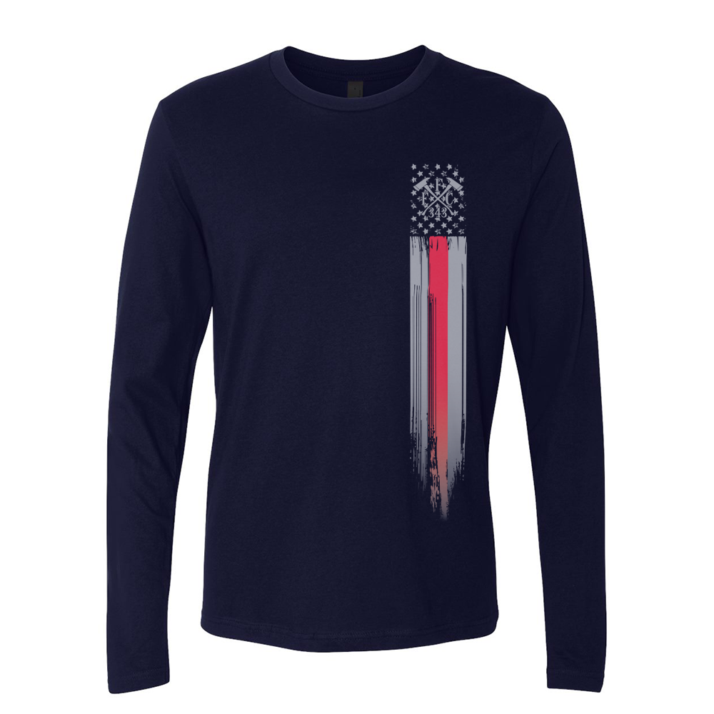 Exclusive Firefighter.com's FFC 343 Brand, the Thin Red Line Stars and Stripes Premium Long Sleeve Shirt is for the American Firefighter Patriot. If you love freedom and firefighting, you need this design for your off duty apparel collection. Left front chest grey distressed American Flag with the FFC 343 crossed axes within the stars and the subdued thin red line down the body, speaks a simple but profound message of dedication to this country and the firefighter mission.