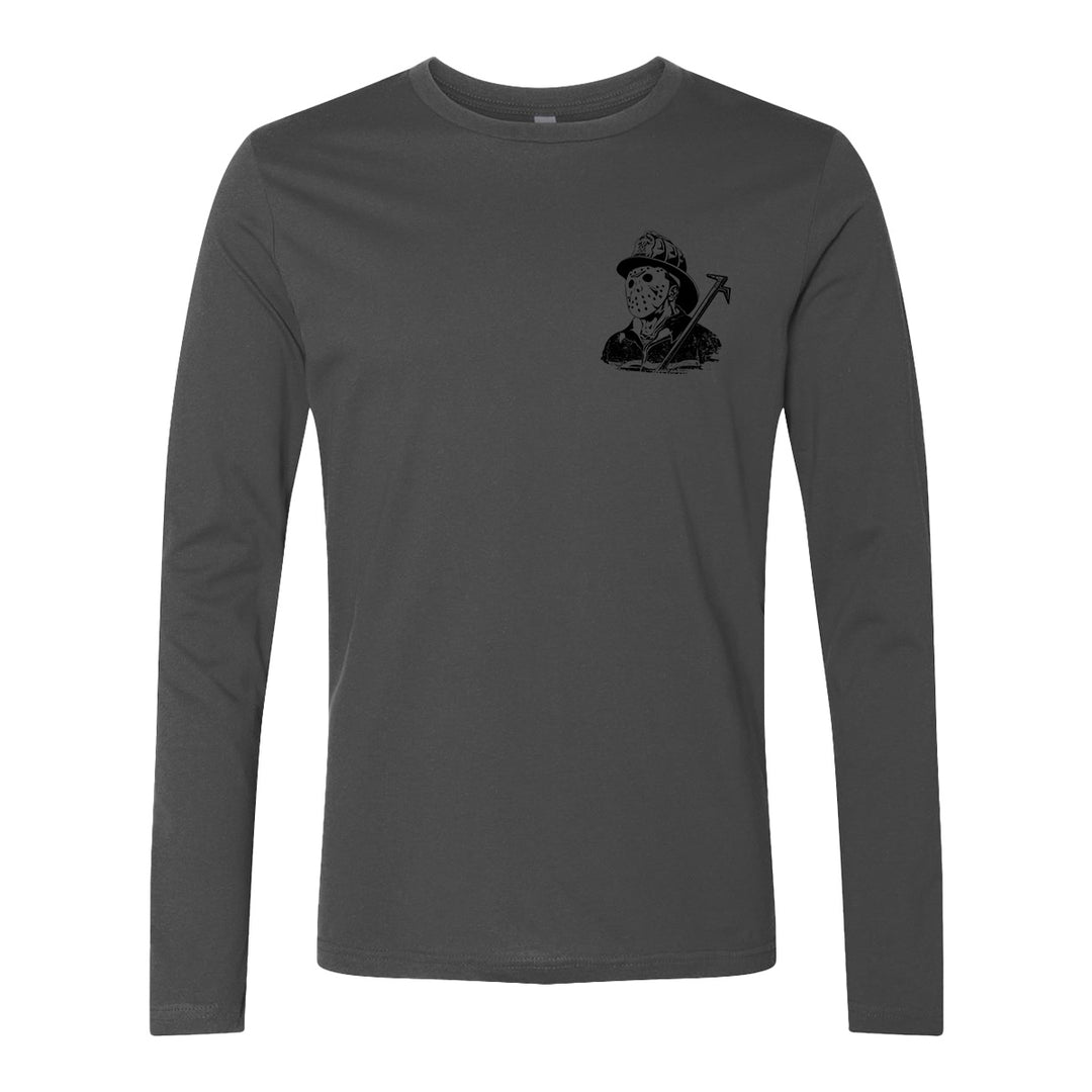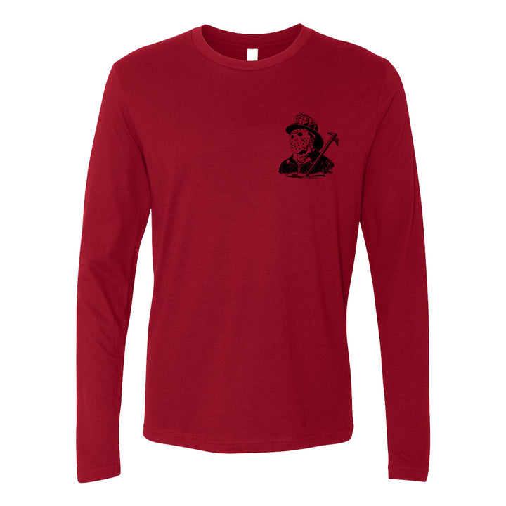 This firefighter long sleeve shirt showcases a bold masked design inspired by Jason from Friday the 13th. Perfect for those in the firefighter community who want to make a striking impression, it blends the intensity of the job with a Halloween-themed style. Made for comfort and durability, this long sleeve tee is great for cooler days, whether you're on the job or enjoying some downtime.
