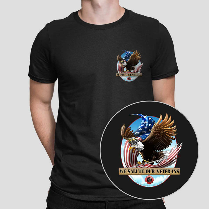 The "Salute Veterans" T-Shirt honors the bravery and service of those who fought for freedom, both in the firehouse and on the battlefield. Featuring a fierce eagle in a firefighter helmet, backed by the USA flag, this shirt proudly states, "We Salute Our Veterans." With the FFC logo at the bottom, it’s a bold reminder of the sacrifices made by our heroes.
