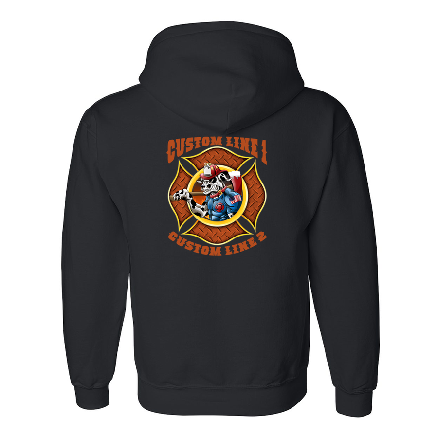 A classic Fire Station Design with a modern twist. The Firefighter Dalmatian has been a Fire Department and Station symbol from the beginnings of Firefighting history. This Firefighter.com exclusive design features a modern take on this classic symbol with a brown and yellow-gold diamond plated Maltese Cross with a Fierce and Determined Dalmatian Dog dressed in a Firefighter Duty Hoodie, wearing a Fire Helmet and a Fire Fighter Axe. Customize the 100% premium soft style cotton Hoodie with two text lines printed in brown above and below this artfully created design. Add your Fire Department Name, Fire Station Number, Name or Rank to create this perfect on-duty Hoodie. This premium Hoodie is available in Navy, Black or Grey.