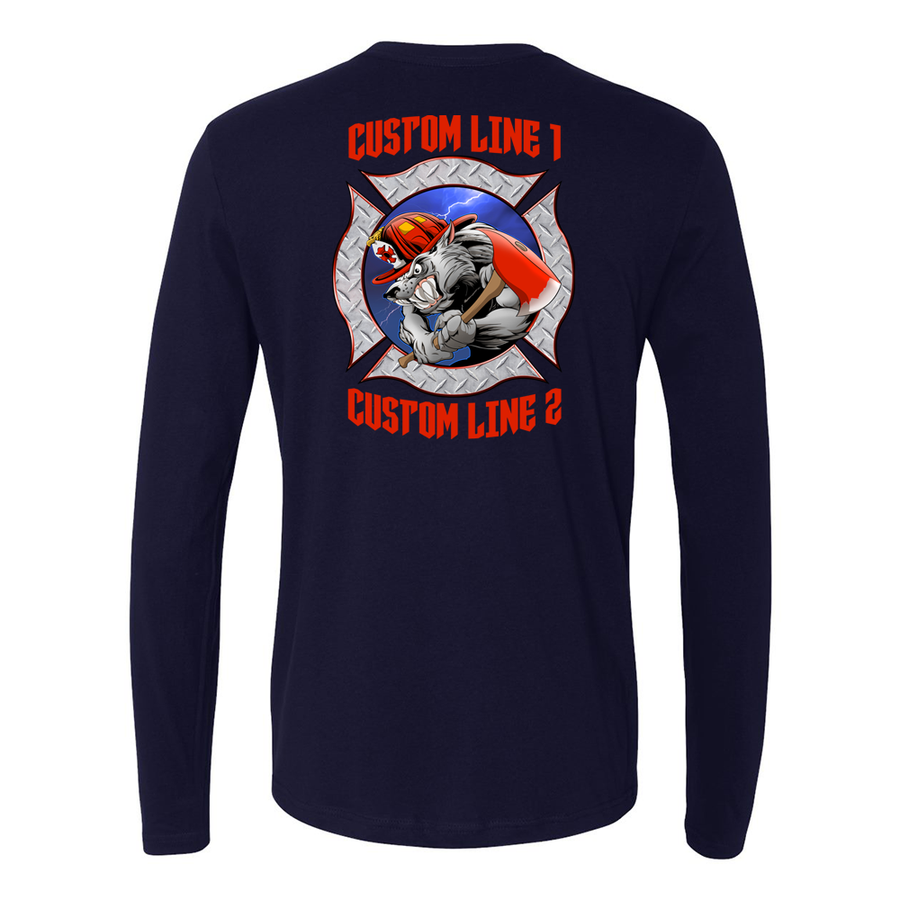 This premium 100% soft style cotton Long Sleeve Shirt features a grey and red diamond plated Maltese Cross with a Fierce Grey Wolf wearing and Fire Helmet and holding a Firefighter Axe with a dark night lightning filled sky. Customize this Premium Long Sleeve Shirt on the Left Chest and Full Back with two custom text lines. Add your Fire Department Name and Station Number for a personalized touch. This Station Shirt is perfect for both professional and volunteer fire fighters. This premium Long Sleeve Shirt is tailored at the waist for a modern fit.