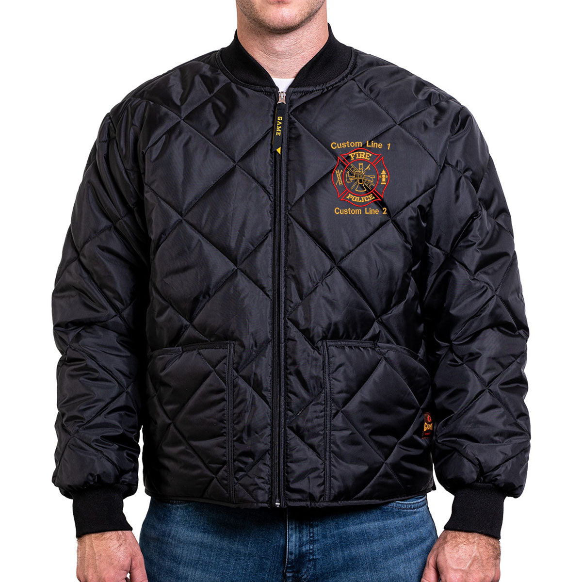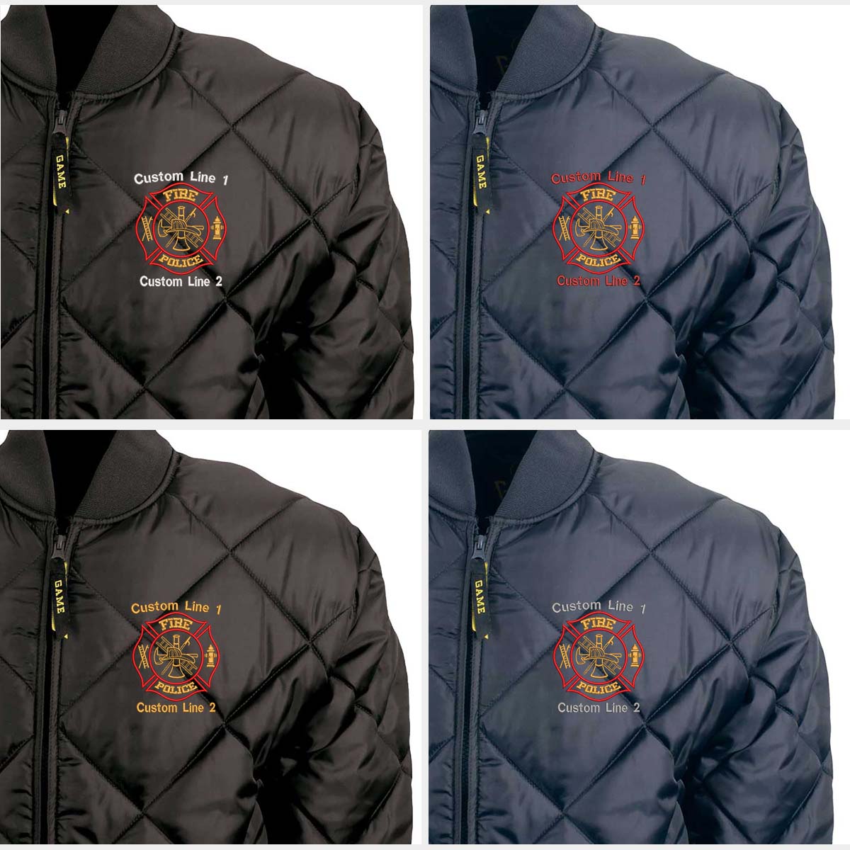 Show your Firefighter pride with the Customized Red and Gold Fire Police Bravest Jacket. This full-zip jacket, available in Navy or Black, features the Fire Police Maltese embroidered logo (4 inches) on the left chest with two custom text lines above and below, stitched in bold Red and Gold for a standout look.