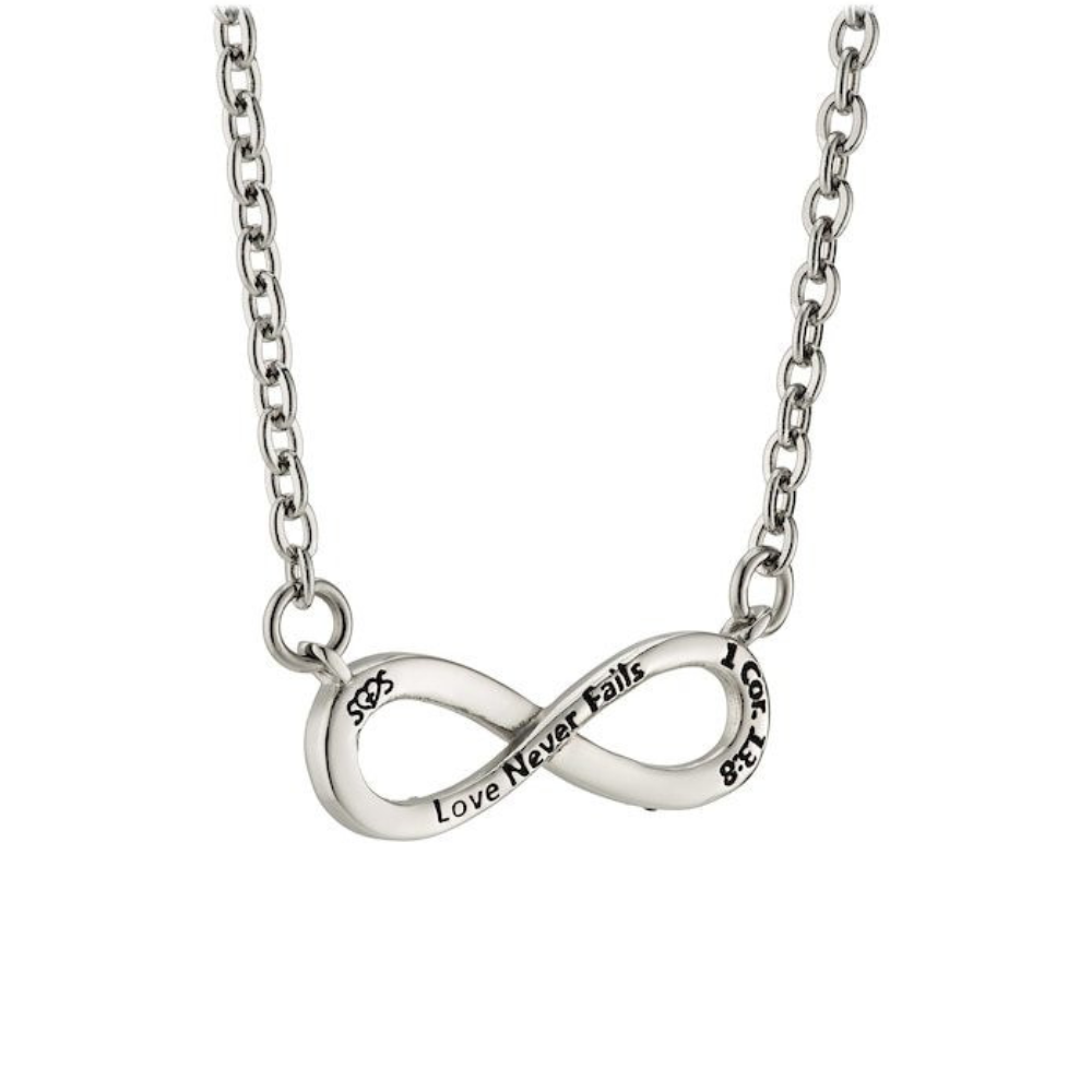 This is a solid stainless steel pendant that measures .90 inches by .30 inches. It has beautiful, flawless, red Swarovski crystals on the front of it. On the reverse of the pendant, an engraved reminder from 1 Corinthians 13:8 tells her that "Love never fails," making it the perfect gift for a birthday, Valentine's Day, or any other day of the year.