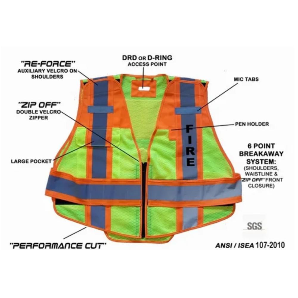 Designed for emergency responders. The double breakaway zipper allows the vest to breakaway from both sides of the zipper, making it a 6 Point Breakaway vest. The performance cut offers max comfort and allows access to rescue gear pockets or portable radio at the waistline. A Chevron reflective pattern on the back offers max visibility.