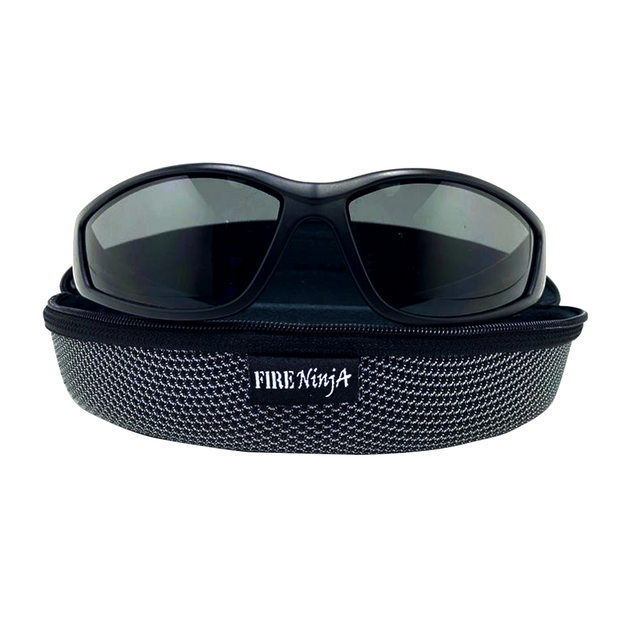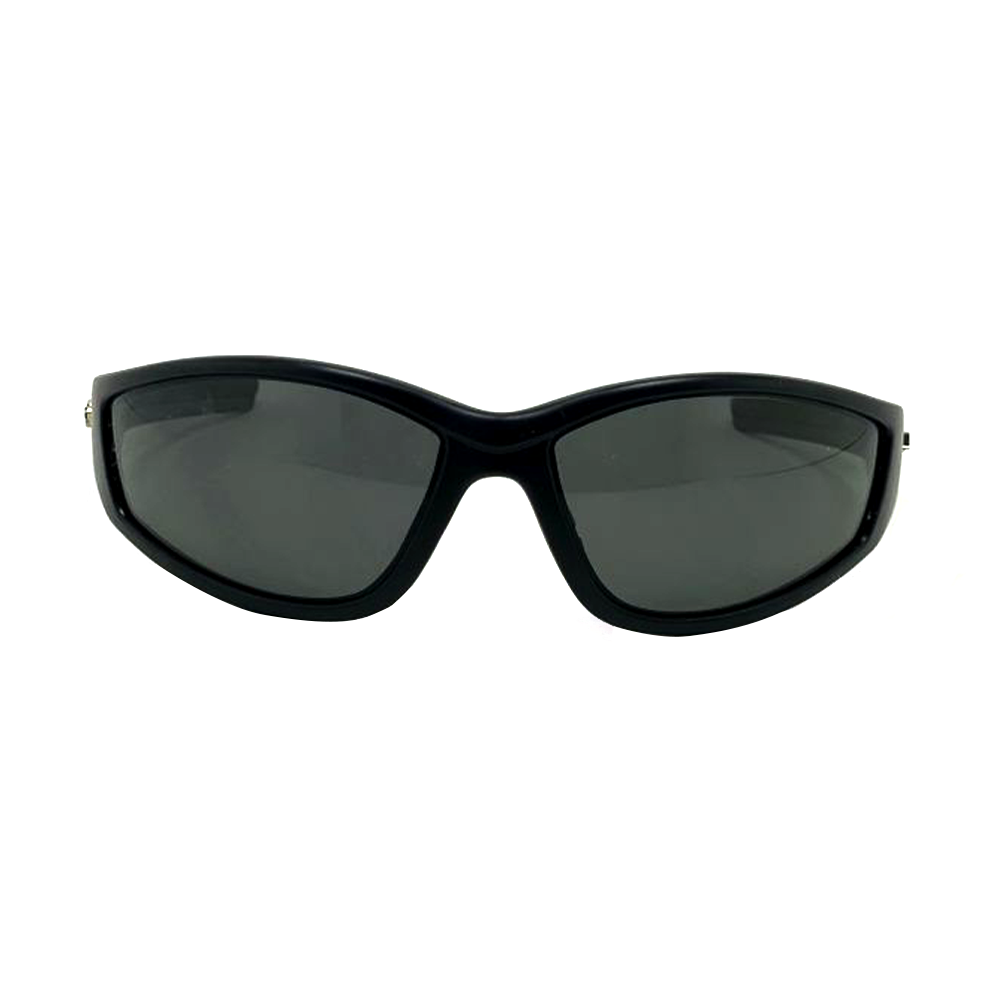 Anti-impact sunglasses have matte black frames with gray accents, made of durable nylon material. The lenses are smoke color polycarbonate shatter proof material with scratch resistant and anti-fog coating.