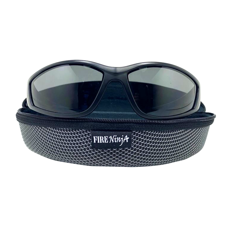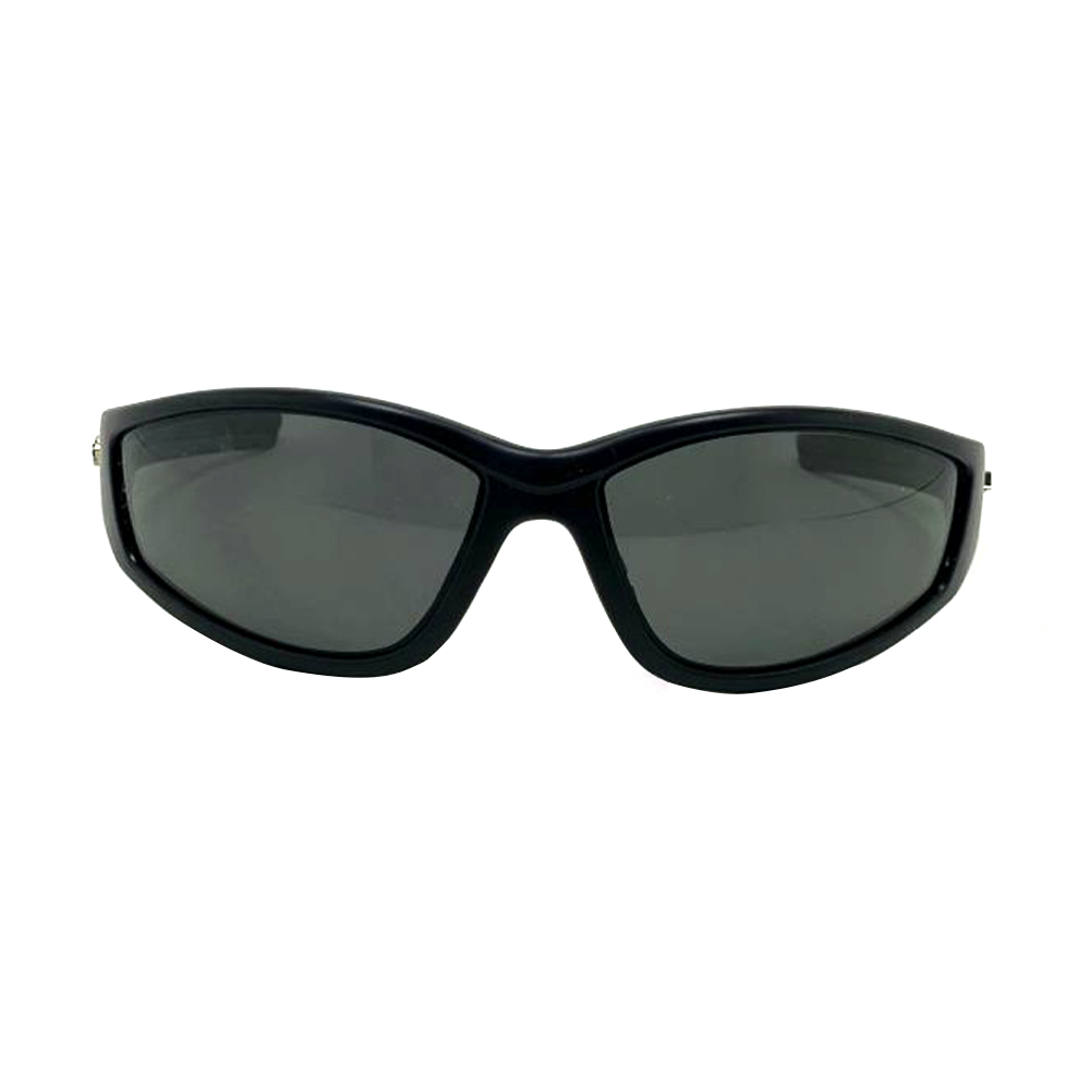 Anti-impact sunglasses have matte black frames with gray accents, made of durable nylon material. The lenses are smoke color polycarbonate shatter proof material with scratch resistant and anti-fog coating. These safety sunglasses feature UV400 Lens Technology, absorbing over 99% of harmful UVA and UVB spectrums.