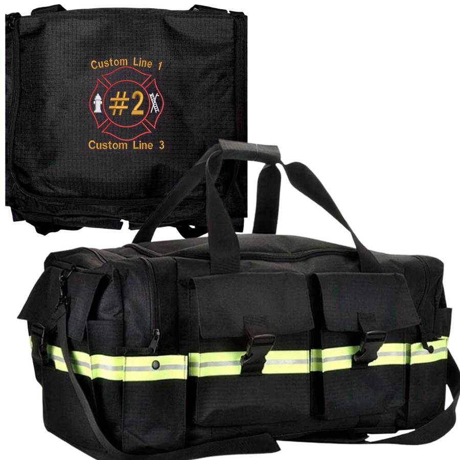 Customize the Black Duffel Station Bag by Sgt Fire Bags with a 4 Inch Firefighter Maltese Cross and 3 Custom Text Lines. Choose your thread color of white, silver, red, gold or yellow for your customized text.
