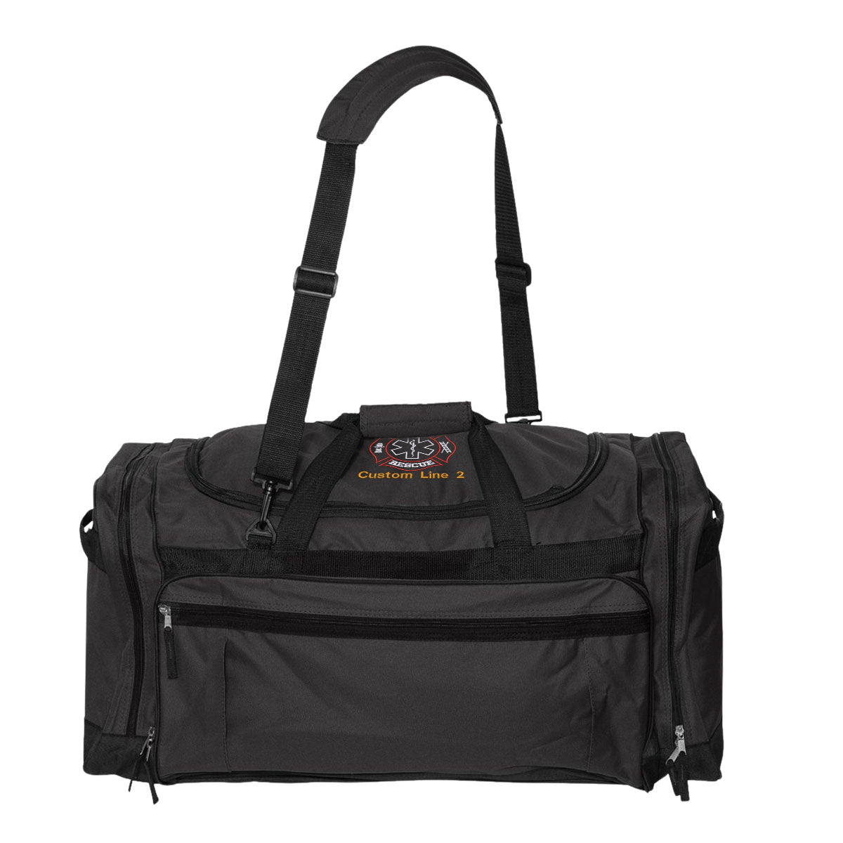 Carry your gear with pride in this 27" large duffel bag featuring a bold Fire Rescue Maltese embroidered in your choice of red and white or red and gold. Customize it further by selecting your own custom text color for two lines—perfect for adding your name, station, or department. With spacious side pockets and a padded shoulder strap, this durable duffel keeps your gear organized and ready, whether for call-outs, the gym, or travel.