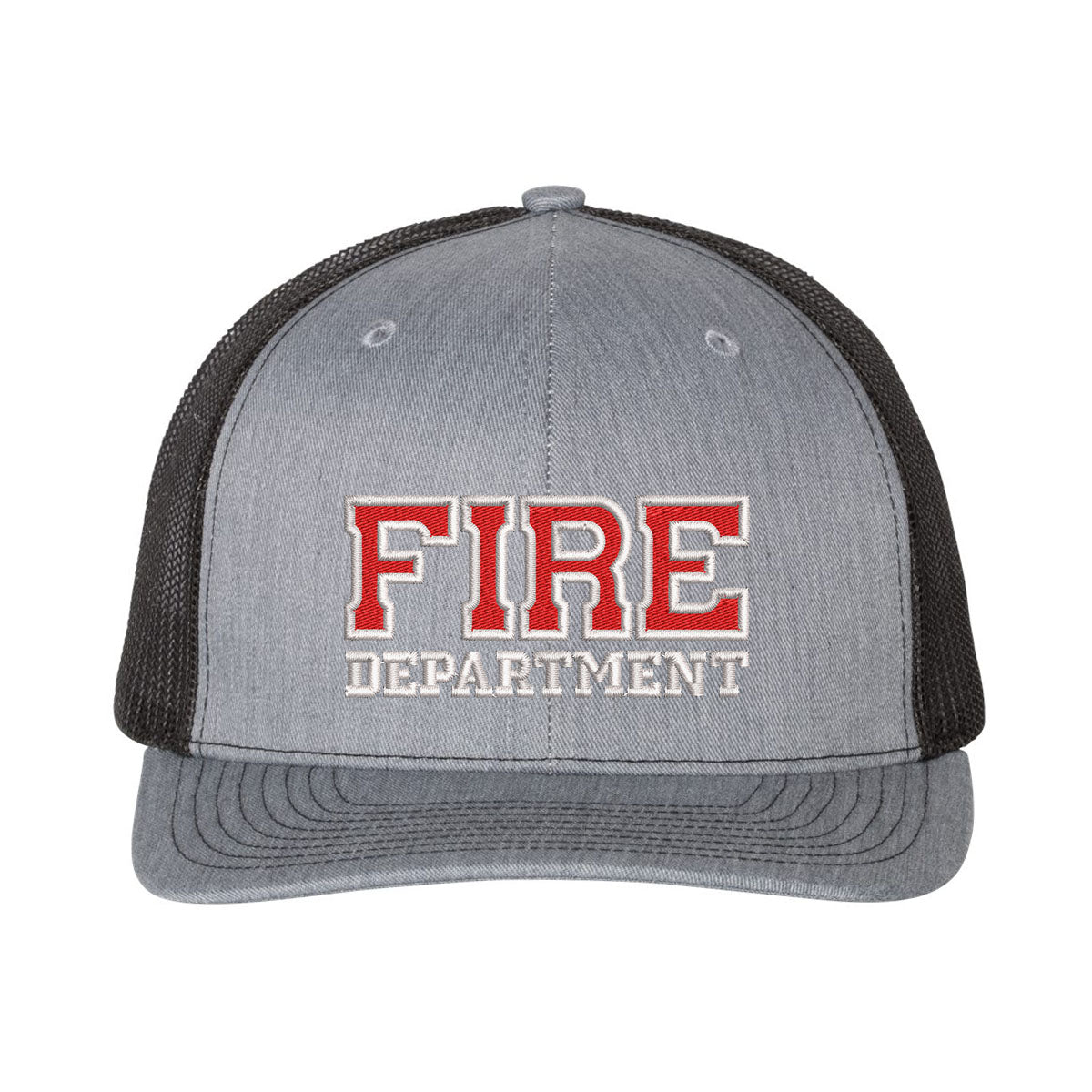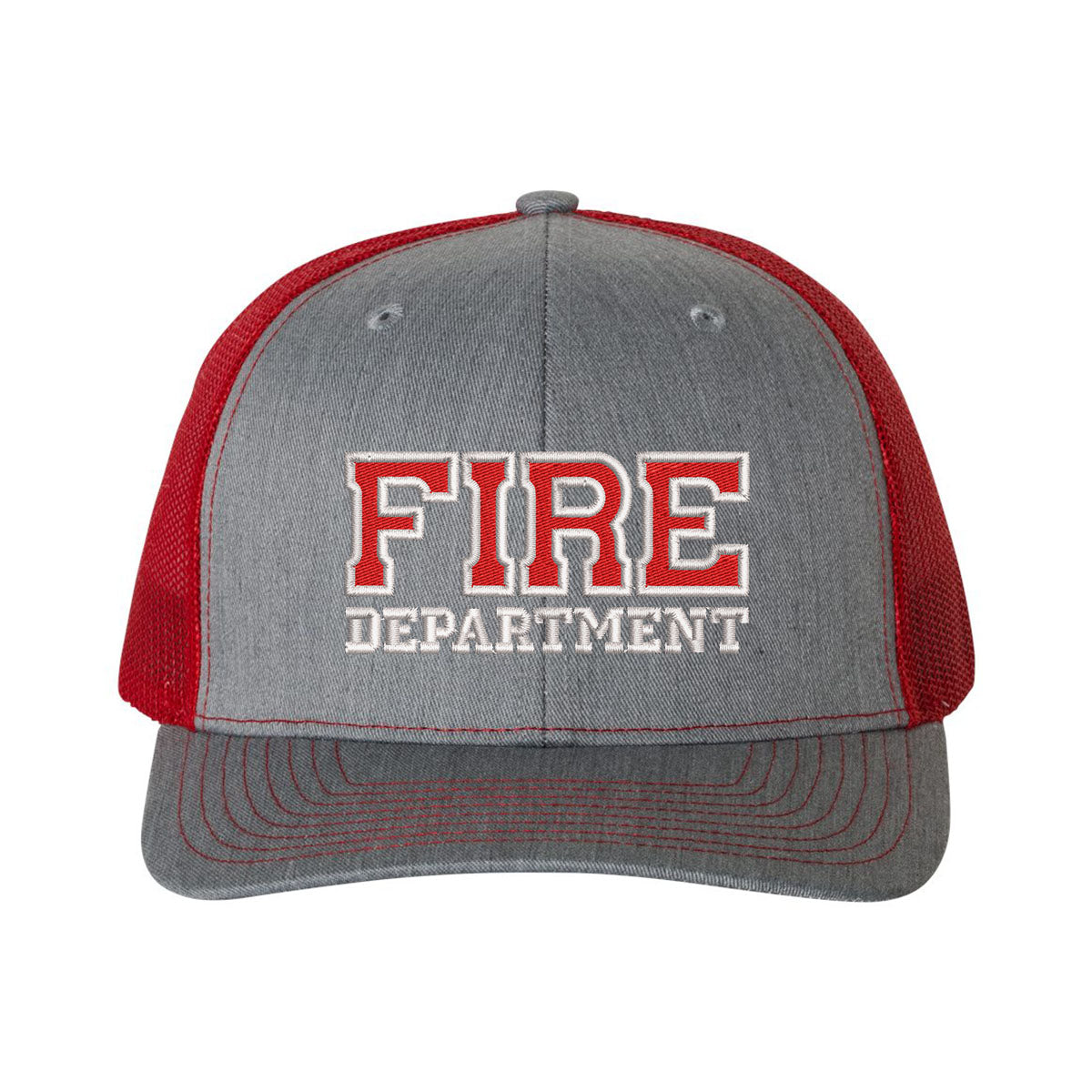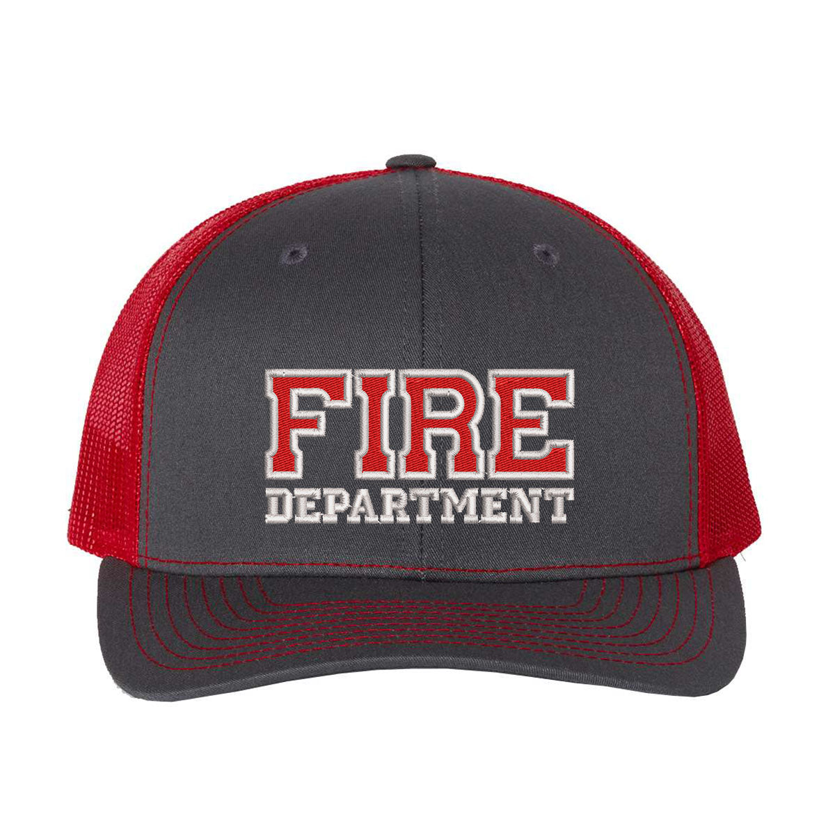The popular and comfortable Richardson Style Trucker snap-back hat features the Fire Department prominently embroidered in red and white stitching on the center front panel.