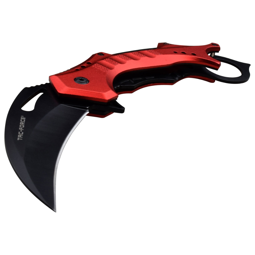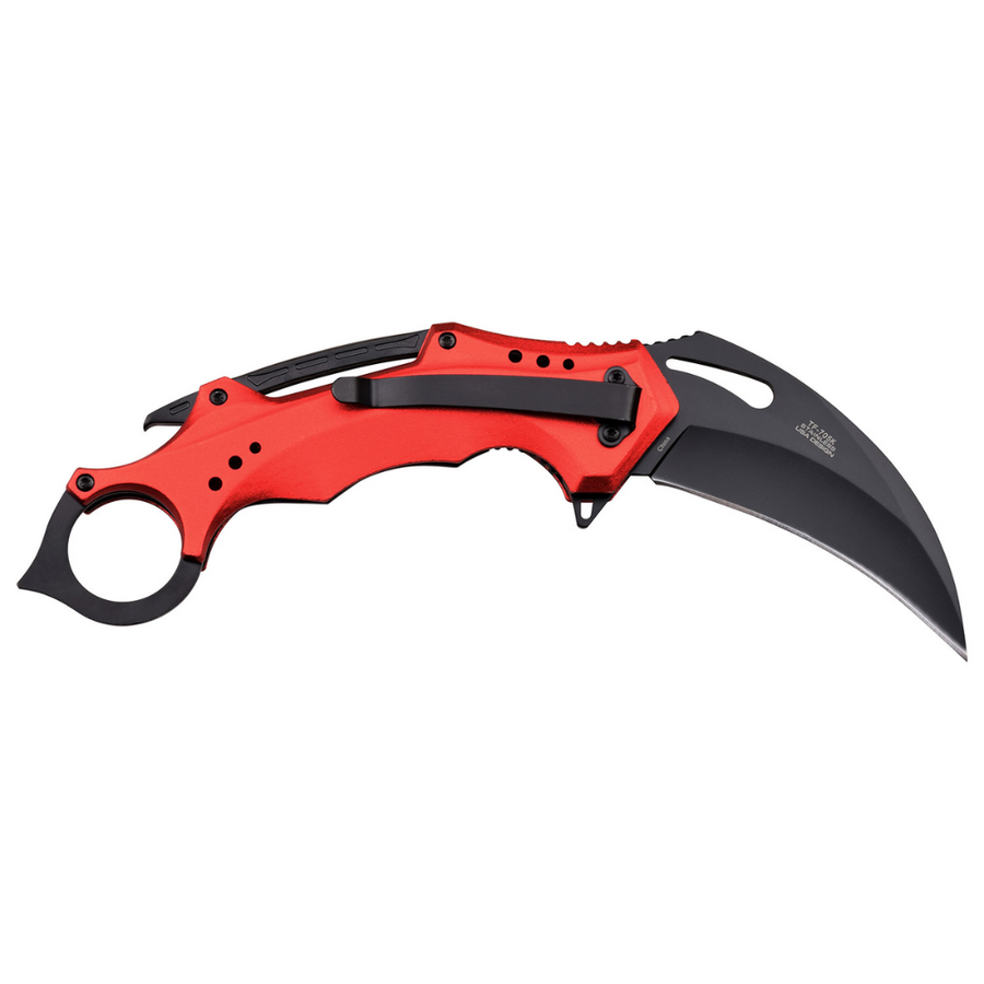 - SPECIAL FEATURES: Spring Assisted, Black Stainless Steel Karambit Blade, Finger Flipper, Liner Lock, Red and Black ALuminum Handle with Finger Ring, Bottle Opener and Pocket Clip.